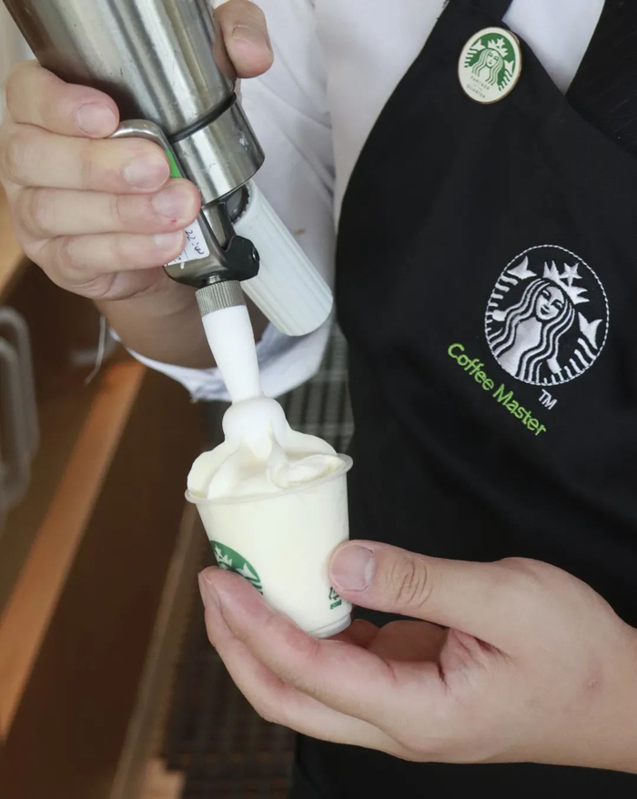 我喝卡布奇诺,狗狗也有爪布奇诺,每次吃得嘴巴一圈白花花的。现在它到其他星巴克店外面都会条件反射,以为我要喂它吃奶油了。