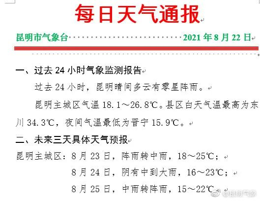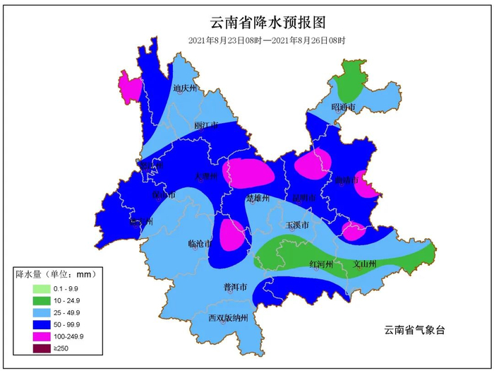 此外,据云南气象消息:受低涡切变和冷空气共同影响,预计8月23-25日云南省将自北向南出现强降水过程。其中,曲靖、文山北部、昆明、楚雄、丽江、大理、迪庆西部、怒江、保山、德宏、普洱北部将出现大雨局部暴雨或大暴雨,过程累积雨量30~60毫米,局地80~120毫米,并伴有明显强对流天气。
