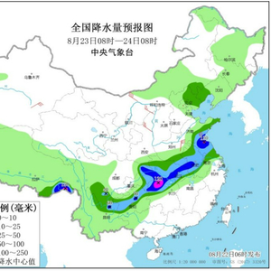 据中央气象台22日发布的天气公报:8月23日08时至24日08时,华北北部、辽宁西部、西藏东南部、四川南部、云南北部、贵州中北部、江汉大部、江南北部、江淮、黄淮东部和南部等地部分地区有中到大雨,其中,西藏东南部、山东南部、江苏北部、安徽中部、湖北东部和南部、湖南北部、重庆东北部、贵州中部、云南东北部等地部分地区有暴雨或大暴雨(100~150毫米)。内蒙古中西部、新疆南疆盆地、西北地区中东部、东北地区中南部、黄淮大部等地部分地区有5~7级风。