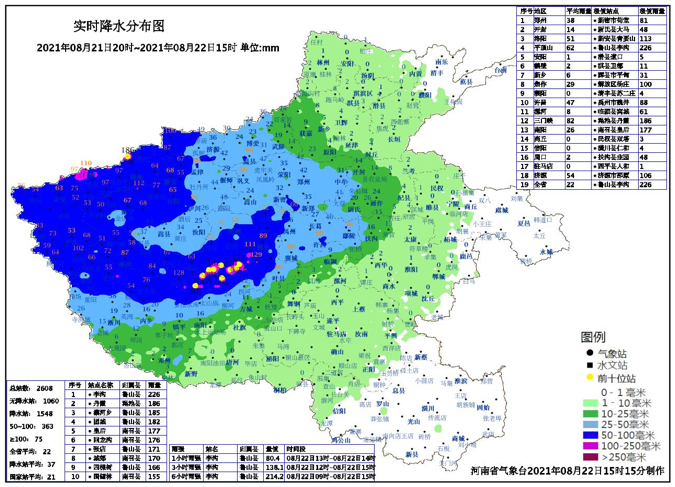 河南省气象局公布的最新监测数据显示,8月21日20时至22日15时,河南省大部出现小雨,中西部中到大雨,济源、焦作、三门峡、洛阳、南阳、平顶山、郑州、许昌、漯河等地出现暴雨、局部大暴雨。地市平均降水量最大三门峡81.8毫米,有438个雨量站降水量超过50毫米,大于100毫米的有75个,最大鲁山县李沟225.6毫米,其最大小时雨强80.4毫米(8月22日13时-14时)。