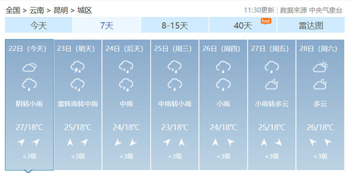 25日:迪庆北部、怒江北部、丽江南部、大理北部、保山西部、德宏、普洱北部、临沧东部阴有中到大雨局部暴雨,其它地区阴天间多云有小到中雨局部大雨。