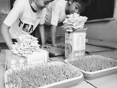劳动课上,七七老师带领孩子们自己动手整理书包、叠衣服,分组种豆苗、种蘑菇,每天早晨来了第一件事,孩子们都会围着他们种的豆苗、蘑菇,仔细端详,满眼的惊喜和期待。除此之外,七七老师还教孩子们制作倡导垃圾分类的垃圾桶等,每天带领孩子们清理教室卫生,进行校园绿化,带孩子们做创意水果沙拉,煲石头汤。