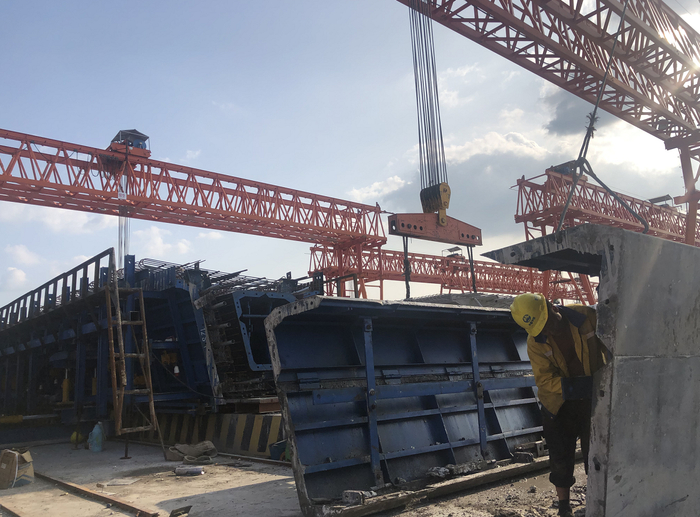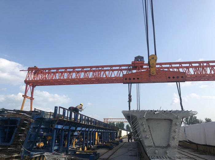 在紧邻长阳路一片圈起来的工地上,一座座高大的龙门吊正在轻松“传送”着重达110吨的箱梁,将有2274片箱梁在这里“预制”,直接运送至京雄高速线路上完成搭建。“梁厂创新应用液压走行模版,代替传统分块拼装,不仅重要环节生产速度提升一倍,还极大节省了人力。”肖博介绍。记者在现场看到,每片制造好的箱梁上都有一个二维码,扫码后可以清楚看到设计尺寸、混凝土强度等技术指标和负责人员信息,做到了每片梁都可追溯。