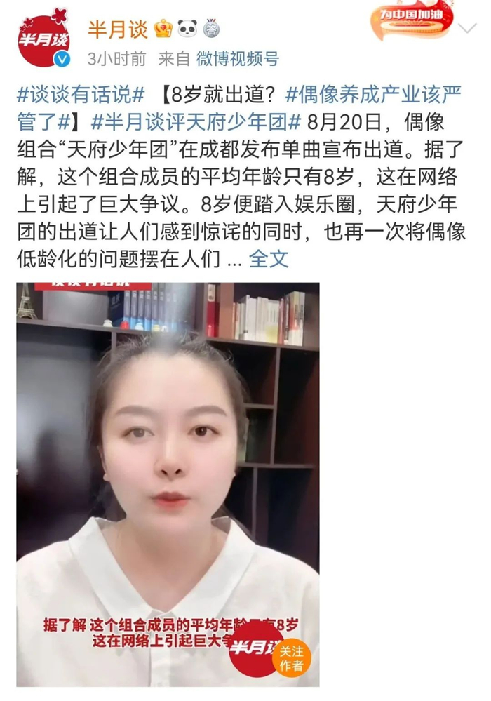 8月23日,半月谈发声称,8岁便踏入娱乐圈,天府少年团的出道让人们感到惊诧的同时,也再一次将偶像低龄化的问题摆在人们面前。