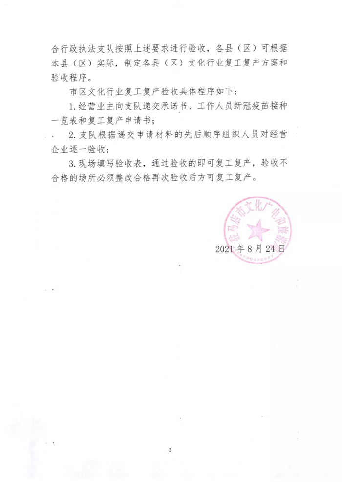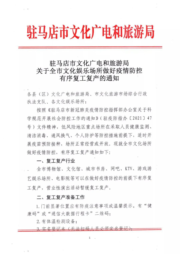 新京报快讯 据掌上驻马店微信公众号消息,驻马店市文化广电和旅游局发布通知,全市博物馆,文化馆,城市书房,网吧,KTV,游戏游艺娱乐场所,电影院等可以在做好疫情防控的前提下有序复工复产,营业性演出活动暂缓复工复产。