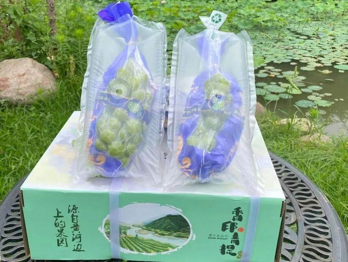 早上新鲜采摘的青提套上定制包装袋,用气柱包裹,给阳光玫瑰优质保护,产地直发,给你送上zui新鲜的阳光玫瑰!