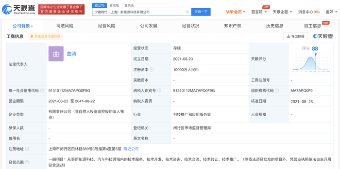 宁德时代(上海)新能源科技有限公司法定代表人为曲涛,注册资本1亿人民币,注册地址位于上海市闵行区,经营范围包括从事新能源科技、汽车科技领域内的技术服务、技术开发、技术咨询、技术交流、技术转让、技术推广。股东信息显示,该公司由宁德时代新能源科技股份有限公司(300750,下称宁德时代)全资控股。