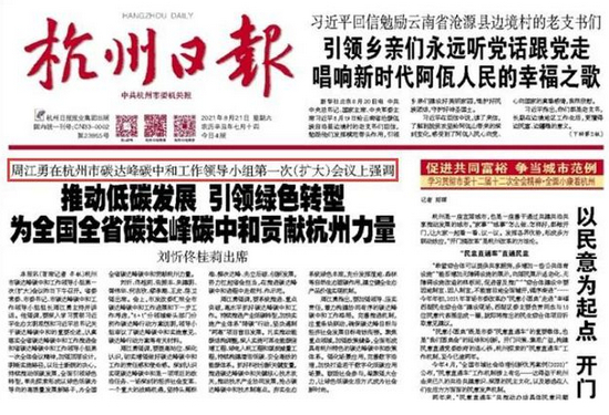 8月20日下午,杭州市委书记周江勇还在以“市碳达峰碳中和工作领导小组组长”的身份出席相关会议,部署任务。