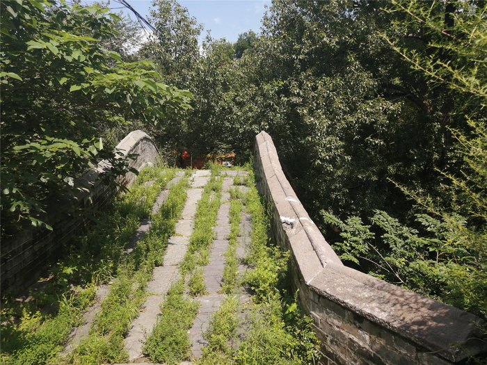 登顶西山森林公园后,沿着古香道一路向西,在青龙山与翠微山之间的山涧上,有一座单孔石拱券古桥。桥体以山石垒砌而成,拱券至桥面只有一层石板,显然不能过分承重。也无重可承,古桥两边的狭窄山路根本无法通行车辆。桥面平整,与连接两边的山路均以石块铺成,浑然一体,加上边沿没有护栏,不论从东向西行走,还是从西向东行走,都容易将其忽略。
