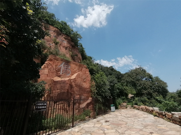 京西古香道上的这处摩崖石刻位于香山东南、八大处以北的青龙山上。山巅一块坐西朝东的褐色巨石上,镌刻着一尺见方的三个大字——狮子窝,下面是一个更大的“佛”字,约一米见方。说是巨石,其实是山体的一个剖面,山体被劈开后,露出植被下面的岩石。那个剖面旁边长满了低矮的灌木和野草,像是披上去的一件外套。剖面跟前有一道铁栅栏,铁栅栏上悬挂着一块警示牌,告诫游人“自觉爱护文物,严禁乱涂乱画”。