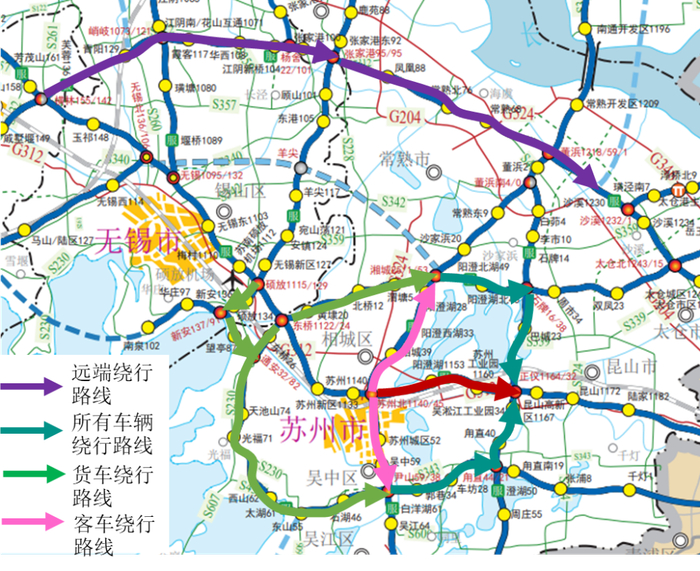 其中,前往苏州新区的货车可在东桥互通或黄埭互通下高速绕行普通公路。