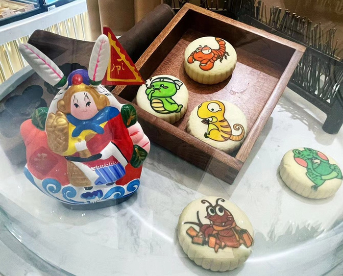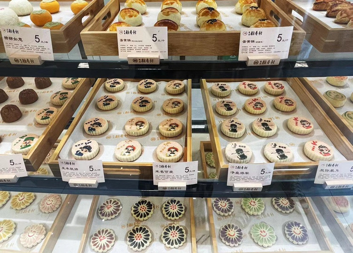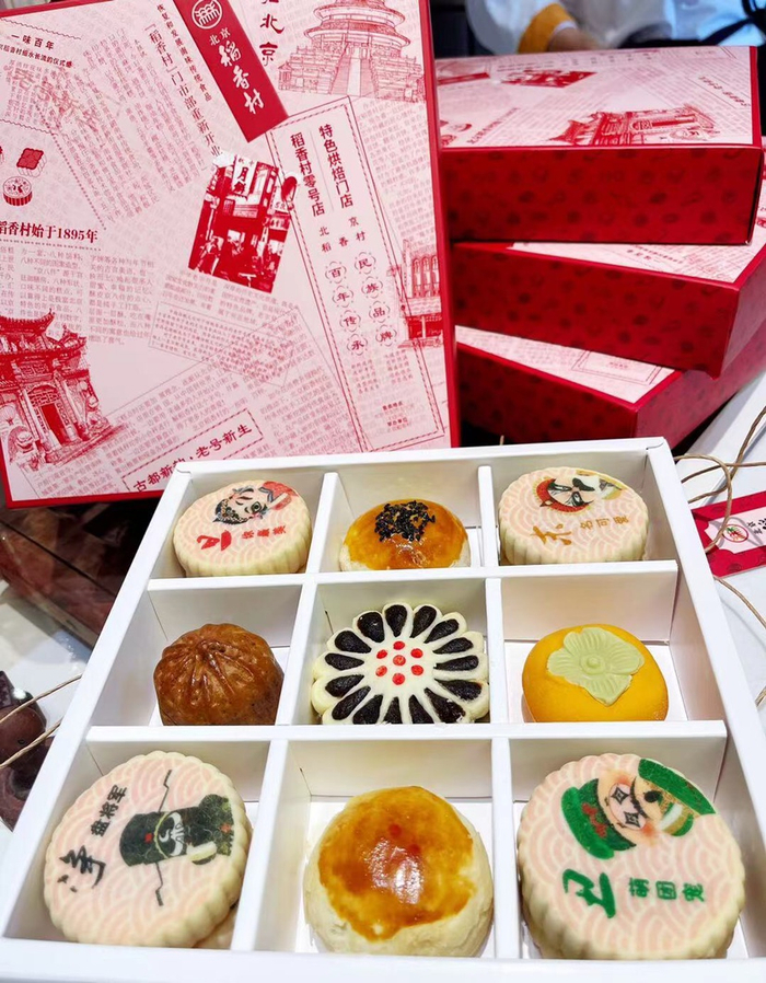 销售柜台旁边就是操作间,消费者可以透过明亮的玻璃看到师傅们现场制作糕点的过程。绿豆馅经过模具轻轻一磕,就化身成为纸、笔、砚台等不同立体造型的“文房四宝”糕点;国潮京韵的京剧脸谱以一个个卡通形象跃然于一块块糕点上,颇具萌趣;还有颇具老北京特色的“文玩核桃”、柿子形状的“柿柿如意”、东四北大街152号的“胡同门牌”等创新糕点,都透出浓浓的京味儿。