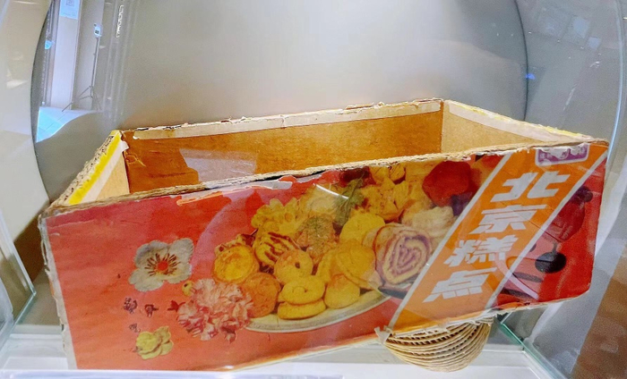 门店另一侧的墙壁则用各式老物件和老报纸装饰起来。旧时的糕点纸盒和月饼模子、分割面剂儿用的顶盅、装饰饼面的糕点戳、在饼干生坯表面擀制出纹路的花棍、用于制作酥皮类糕点擀制生坯面团时使用的走锤……各式各样的老物件,传递出这家百年老字号的历史。