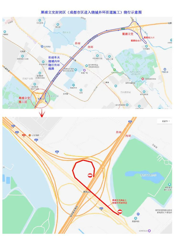 2021年9月1日至9月6日,每晚22:00至次日6:00,成都绕城高速(G4202)犀浦立交南向西右转进城和北向西进城匝道桥封闭施工,禁止机动车通行。