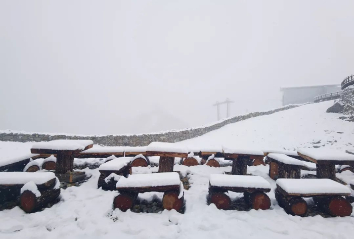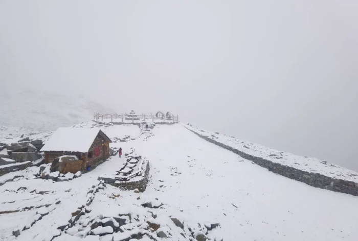 8月25日一早,达古冰川迎来了初秋第一场雪,4860雪山之巅被层层白雪覆盖,云海翻腾之间,似是蓬莱仙境,美到爆了!(达古冰川官微)