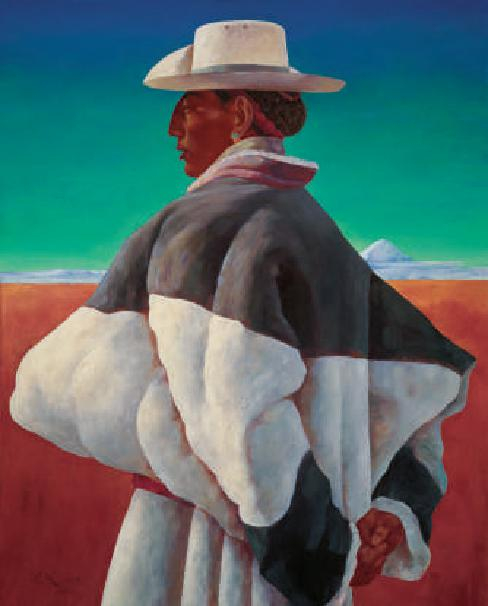 人文主义是文艺复兴的核心价值之一,肖像作为体现人文精神的载体,是巴荒艺术追求的重点。可以这么说,藏人肖像对于巴荒而言是青藏高原古老存在的现实肉身化;或者说将藏人形象进行文艺复兴式的图像学处理,是巴荒读懂青藏高原的通道,也是叩开青藏高原奥秘的大门。当然,巴荒创作这样的肖像时要面临很多挑战。通常画家绘制肖像,其标准是要画得非常像模特——如照片那样酷似他(她)的外貌生理特征,一般人理解“肖像”大概就是这个意思,但巴荒追求的绝不仅于此。我从同样是画家的创作心理反推,巴荒创作藏人肖像的时候一定思绪起伏、慎重落笔。首先,她要思考肖像的永恒性问题,这恰恰是文艺复兴肖像主要考虑的命题;其次,她要思考绘画的语言问题,运用何种材料技法才能充分表达内心的积淀与感受;再者,她还要考虑现实的人与恒久大地之间的张力关系,如何通过图像的重构来表达等等。总之,巴荒的藏人肖像是为读懂它的人而准备的,其传达的最重要信息:画家不仅仅是在描绘模特儿此时此地的形象,而且能够将此在肉身置入永恒时空,让读者感觉到肖像既是当下的又是永恒的。巴荒的藏人肖像的每一个组成部分,都是朝向这个目标而去,为此,画家花了很多心思来组织经营画面,包括构图、造型、线面、色彩、笔触……画册封面的“藏人肖像”就是一个典型,这位藏族男子的面部线条陡峻硬朗,与青藏高原上的雪峰同构,内里仿佛蕴含着时空密码;弥漫于画面的艺术语言是高原式的,无论是皮肤的肌理还是服饰的质地都是那样的坚实而织密,仿佛皆经过风沙磨砺,他们与平原丘陵甚至一般的山地完全不一样。所有的奥秘都来自于青藏高原本体。从自然地理学视角来看,由于阿尔卑斯—喜马拉雅山脉横穿欧亚大陆且是东西走向,它支配了中国西部地区的地形与气候;西北大地上那些一望无际的雅丹地貌、河湖相沉积的风蚀地貌、广袤的高山草甸带、漫漫无边的堆积层以及坚硬的裸露基岩地貌,所有古老沉积全部被时间的砂纸反复打磨过,正是以上这些塑造了当地人的体型与样貌。青藏高原上巨量的信息传导给巴荒,在其内心中掀起了惊涛骇浪,打造了她穿透时空的眼光。在巴荒看来,青藏高原上的人与山是同构的,画山就是画人、画人如同画山。按照巴荒的话来说“这样的话,把有血肉之躯的人与山同构,就是永恒了,我在这里开辟出了一个新的绘画语言探索领域”。
