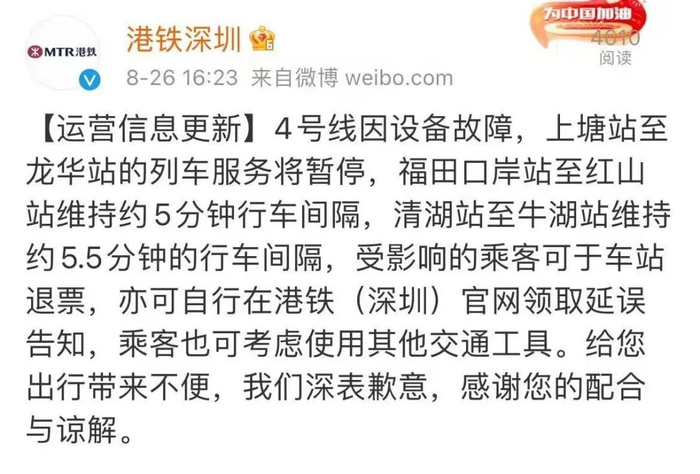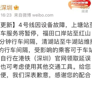突发!深圳地铁4号线设备故障,上塘至龙华站暂停服务