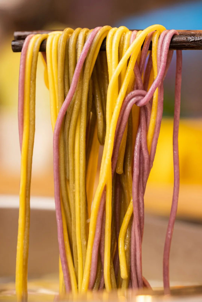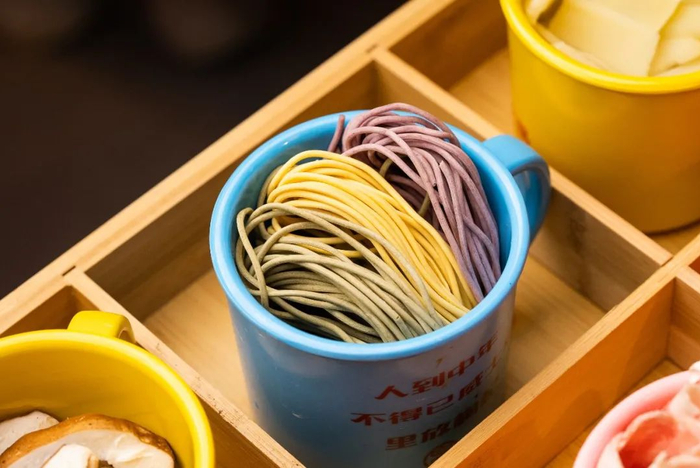 新鲜的白菜、鞭炮笋也是食客时常青睐的素菜,用来解腻再好不过了!还有店里的特色三色面,用了3种不同的蔬果制作而成,面条柔韧有嚼劲,火锅里的主食新宠!