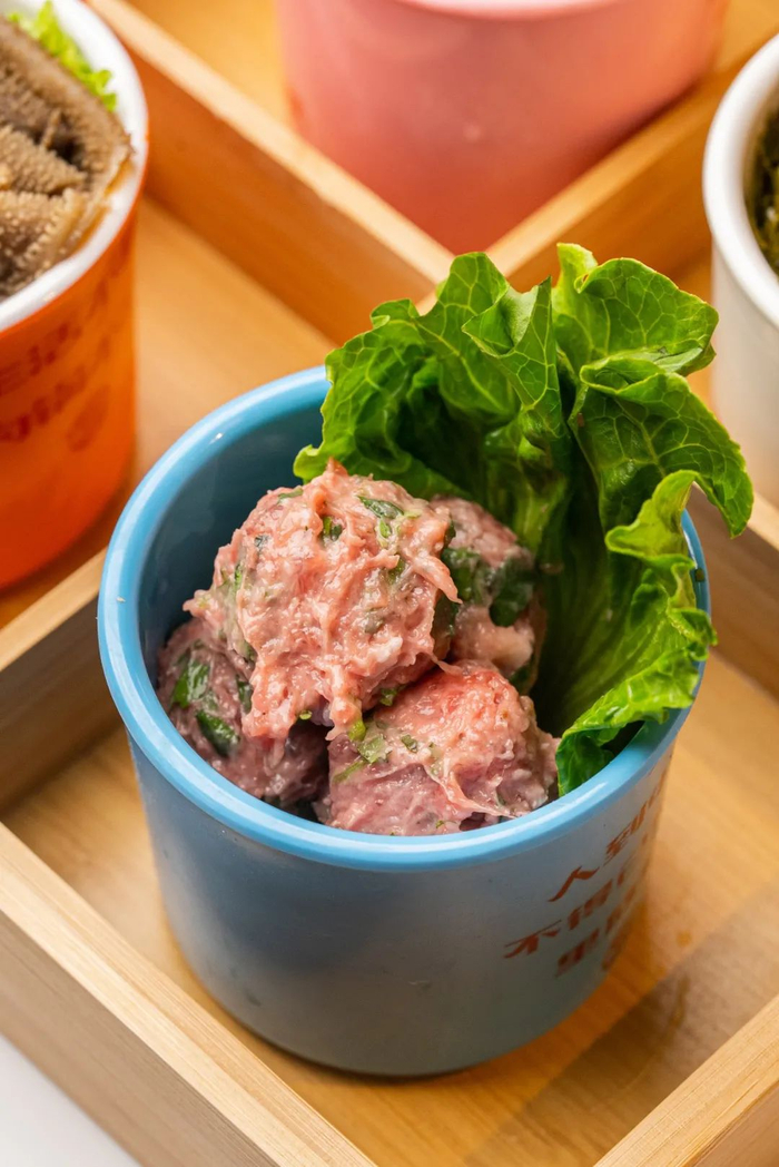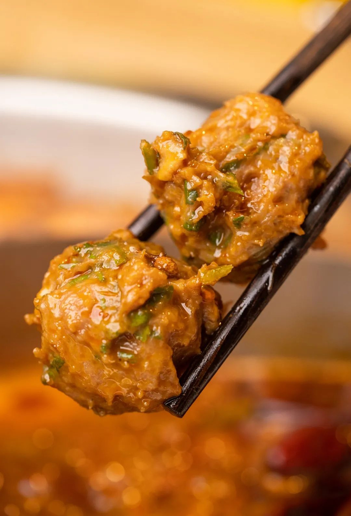 只用鲜嫩牛肉和香菜制作而成,在汤底中遨游几分钟后,丸子已经吸满了红油的汤汁。每一颗都超Q弹,一口咬下去,牛肉和香菜的气味同时迸发出来,yyds!