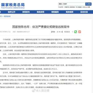 国家税务总局坚决支持上海市税务局第一稽查局对郑爽偷逃税案件依法严肃进行处理,要求各级税务机关对各种偷逃税行为,坚持依法严查严处,坚决维护国家税法权威,促进社会公平正义。