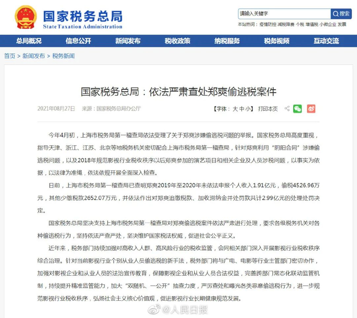 上海市税务部门依法对郑爽偷逃税案件进行处理