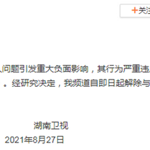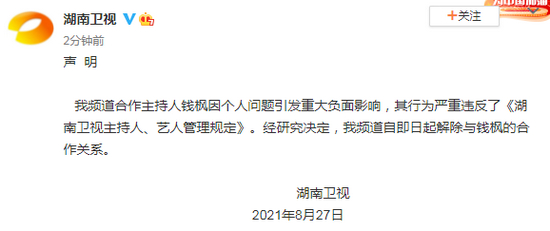 我频道合作主持人钱枫因个人问题引发重大负面影响,其行为严重违反了《湖南卫视主持人、艺人管理规定》。经研究决定,我频道自即日起解除与钱枫的合作关系。