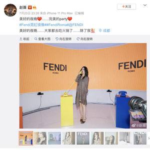 2021年7月23日,FENDI在成都天府新区举办霓虹派对展示2021秋冬男士系列产品,赵薇身着一身驼色系套装压轴出场。这是她最近一次和FENDI的公开活动,当天活动结束,赵薇发了条微博,“美好的夜晚,完美的party”,并@FENDI。