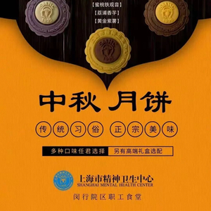 既有传统的广式豆沙和鲜肉月饼,也有创新流心雪梅娘系列,上面印有“上海市精神卫生中心”字样和Logo。