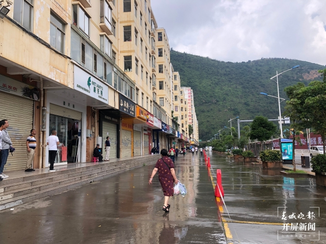 记者来到丽阳星城小区门口,离爆破现场只有一路之隔的小区居民楼一层的商户大部分已经关门撤离,少部分商铺也正在关门。商铺前的人行道上已经拉起了黄色警戒线,每隔一段距离,就有工作人员值守。