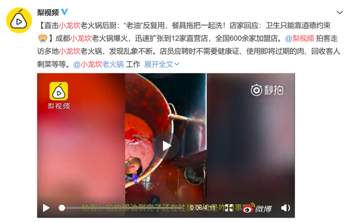 早在2018年5月,梨视频就曾曝光小龙坎在长春、南昌、哈尔滨3地的加盟店后厨存在“老油循环使用”等食品安全问题。