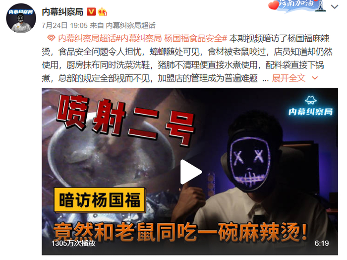 新闻:2021年7月24日,短视频博主“内幕纠察局”卧底杨国福麻辣烫,曝光了其后厨诸多乱象。