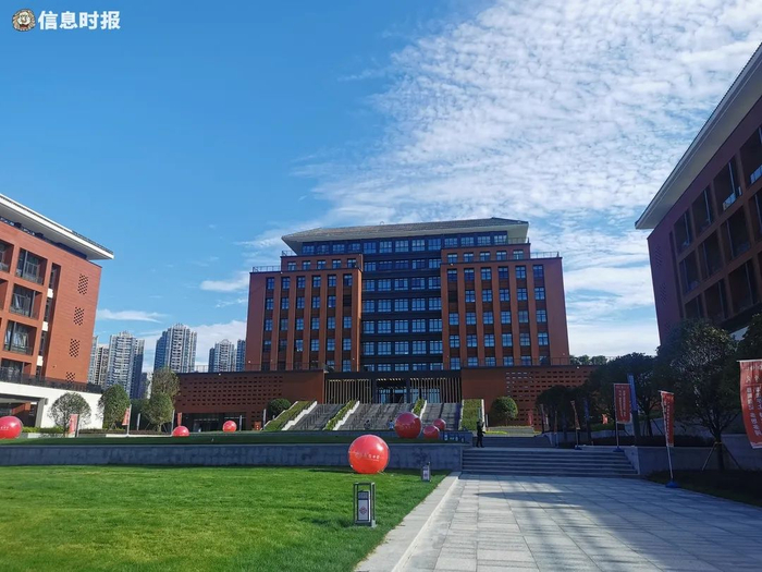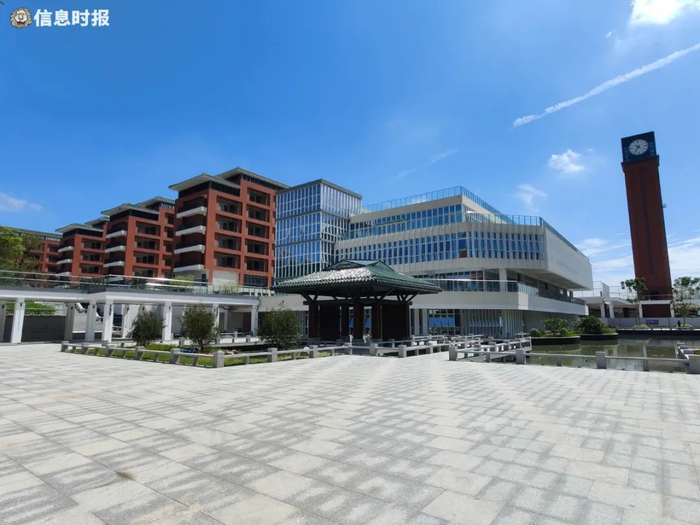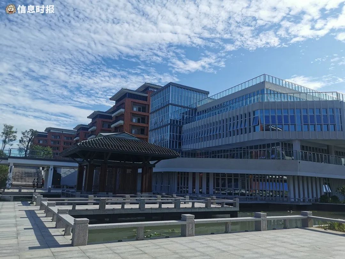 如今这个“山水校园”正式亮相:从红墙绿瓦的执信门进入,正对的便是高大宏伟的图书馆,两侧是教学楼;风雨廊串联校区各处,从教学楼落地窗望过去,山水相映,书香气甚浓。