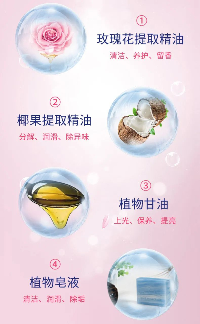看看成分表,排在第一个的是植物皂,然后就是椰油、甘油、玫瑰精油,简单明了,没有伤手的不良成分。
