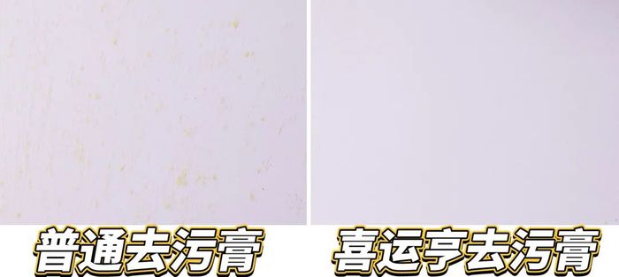 过了几分钟,充分分解油污后再去擦拭,普通去污膏用完还残存着一些油点,用喜运亨就能擦出光洁的墙面,可见这款去污膏的清洁力真的强。