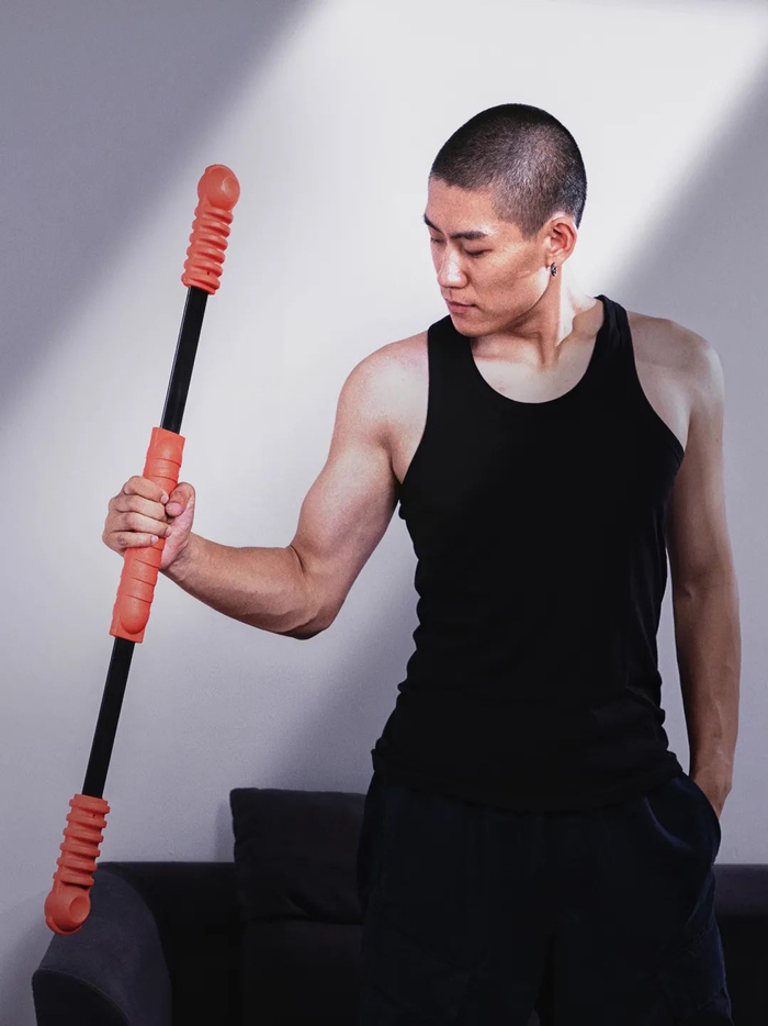 健身棒两头的配重能达到一定的振幅,让它保持快速晃动就需要一定的力量;然后,它与人体肌肉产生的共振就能让全身的肌肉紧绷起来。