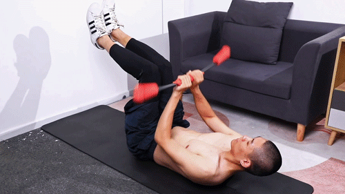 上腹核心就是卷腹的进阶版,上半身靠腹部力量起来,腿也抬起来,然后双臂摆动健身棒;能坚持下来就能腹肌速成了。
