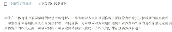 学生在上体育课时,被同学绊倒致使手腕骨折,出事时对方家长带领伤者去医院检查治疗,并支付后期检查费用。学生在家休养期间,家长负责护理,因为是在家里无法提供具体费用的相关证据,请问受伤一方可以向对方索赔护理费,营养费和精神损失费吗?有相关的法律法规吗?