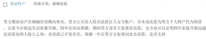 首先,男方婚前房产属于个人财产,售卖后所得的价款仍属于个人财产,但卖房款打入女方账户并用于家庭生活开销。根据司法实践,婚前个人财产在婚后共同生活中自然消耗,离婚时一方主张返还的,法院不予支持。
