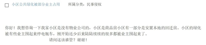 我家小区是没有物业公司的,小区是商品房小区,有一部分是安置本地人的回迁房。小区的公共绿化被有些业主围起来停放电瓶车,刚开始这种现象还少,后来陆陆续续的越来越多绿化都被业主围起来了。我该向谁反映这个情况?