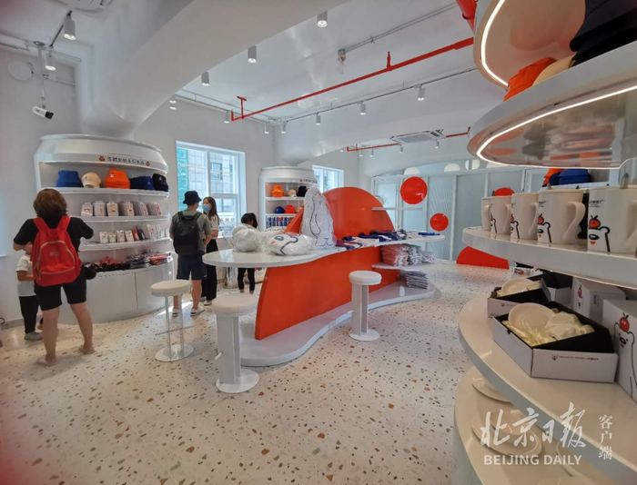 这家新开的体验店面积约300平方米,分为上下两层。一层是现制特调区和百年义利精品区,现制特调区内制作售卖各种特调饮品、手工冰淇淋等,百年义利精品区陈列着果子面包、糖果威化、中式糕点等义利的经典产品。二层则是客座休息区和文创展示区,休息区设置了宽敞的座椅、大桌以及冰冰熊大抱枕,文创展示区陈列着北冰洋最新开发的文创产品,带有大白熊元素的咖啡杯、帽子、手机壳、雨伞等产品静待消费者挑选。