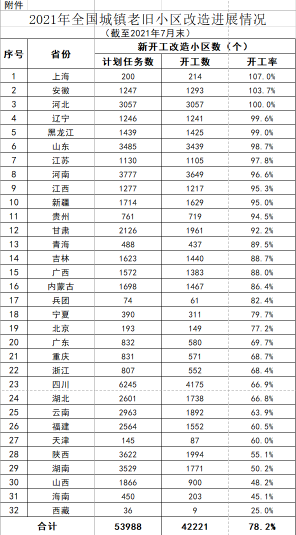 8月30日,住房和城乡建设部公告今年前7个月城镇老旧小区新开工改造情况,经汇总各地统计、上报情况,2021年1—7月份,全国新开工改造城镇老旧小区4.22万个,占年度目标任务的78.2%。较6月末增加了10.7个百分点。