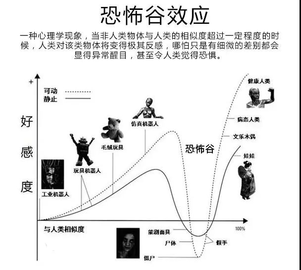 “恐怖谷效应”由日本机器人专家森昌弘在1970年提出,简单说就是一个物体的形象处于极其迫近人类又不完全等同于人类时,我们内心就会反应出惊恐和厌恶。