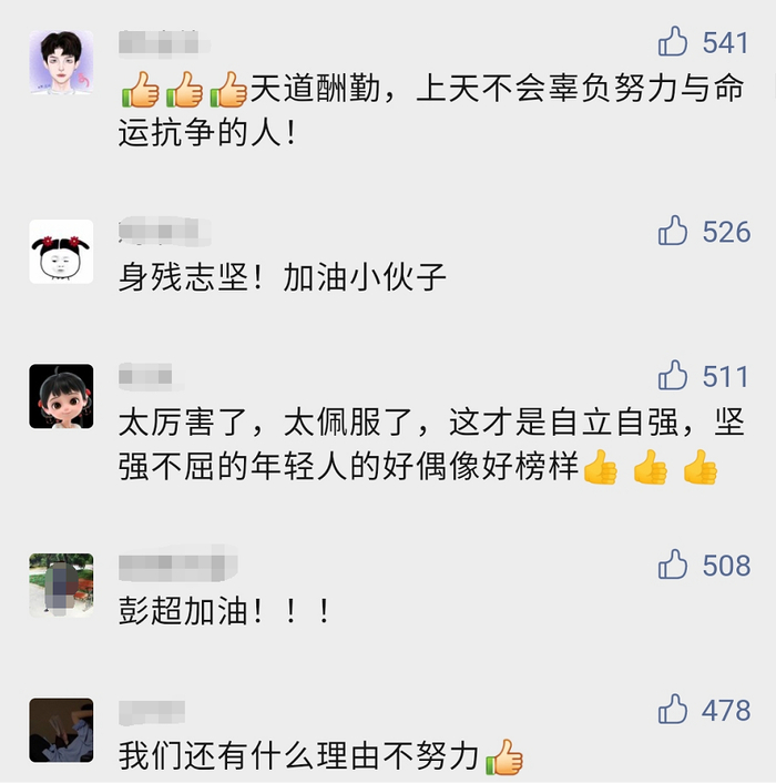 经过努力,他完全做到了以脚代手、生活自理。彭超以608分的高考总成绩考入四川大学法学院。他自强不息,被评为“全国大学生自强之星标兵”和“第六届全国自强模范”。