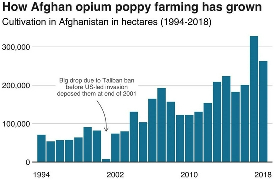 更讽刺的是,阿富汗出产的鸦片的吗啡含量高于其他地方,一度被西方医药公司所青睐。