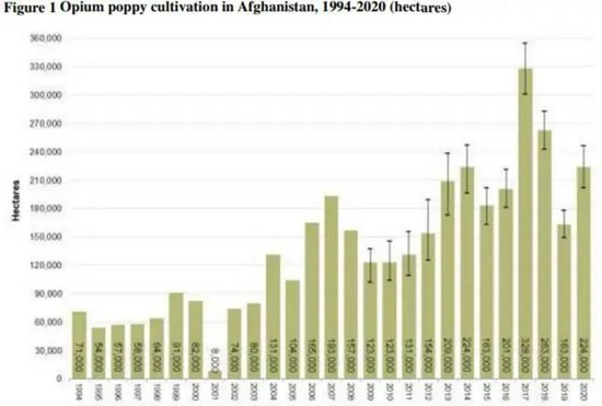 美国政府从2002 财年到 2017 财年,投入大约 86.2 亿美元在阿富汗缉毒,换来的结果却是阿富汗毒品种植面积从 2002 年的约 74000 公顷暴增到 2017 年的约 328000公顷,增长了 340% 以上。同期,潜在鸦片产量增加了约164%,从 3400 吨增加到 9000 吨。