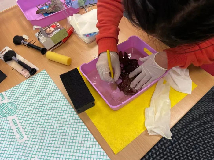 志愿者在德国杜塞尔多夫孔子学院清洗皮影。(图片由志愿者提供)