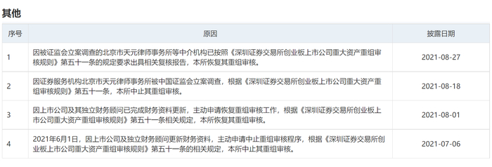 据深交所网站27日消息,因被证监会立案调查的北京市天元律师事务所等中介机构已按照《深圳证券交易所创业板上市公司重大资产重组审核规则》第五十一条的规定要求出具相关复核报告,本所恢复其重组审核。