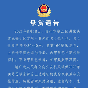 浙江台州警方悬赏10万征集无名女尸线索:穿蓝色绒毛外套 有穿戴美甲习惯
