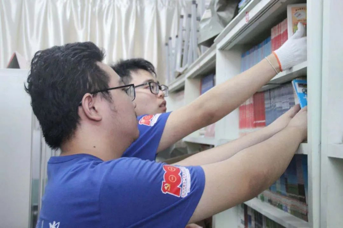 南京理工大学常青藤支教队一队在贵州省铜仁市思南县杨家坳乡小丰溪小学的“雏鸟伴飞”爱心图书馆整理书籍