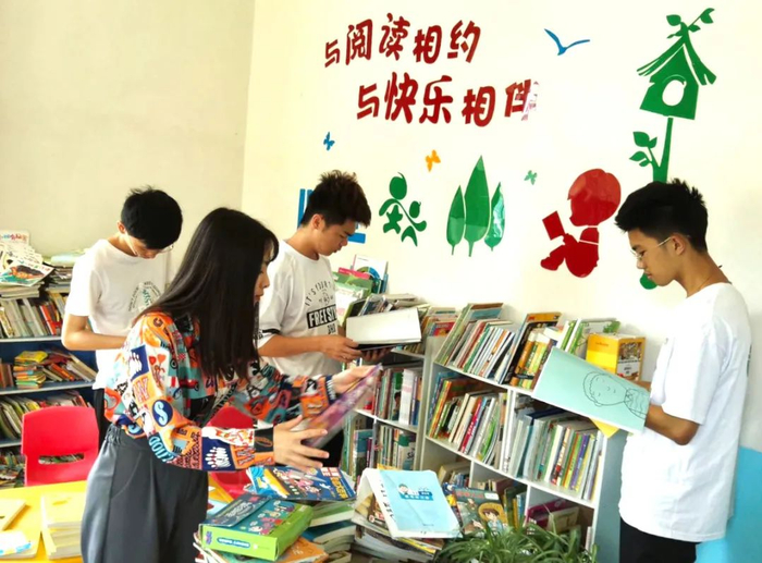 2021年活动启动后,陪伴升级,主办方招募了7支大学生爱心支教团队,利用暑期携书前往爱心图书馆,将童书陪伴升级为大学生伴读。